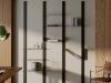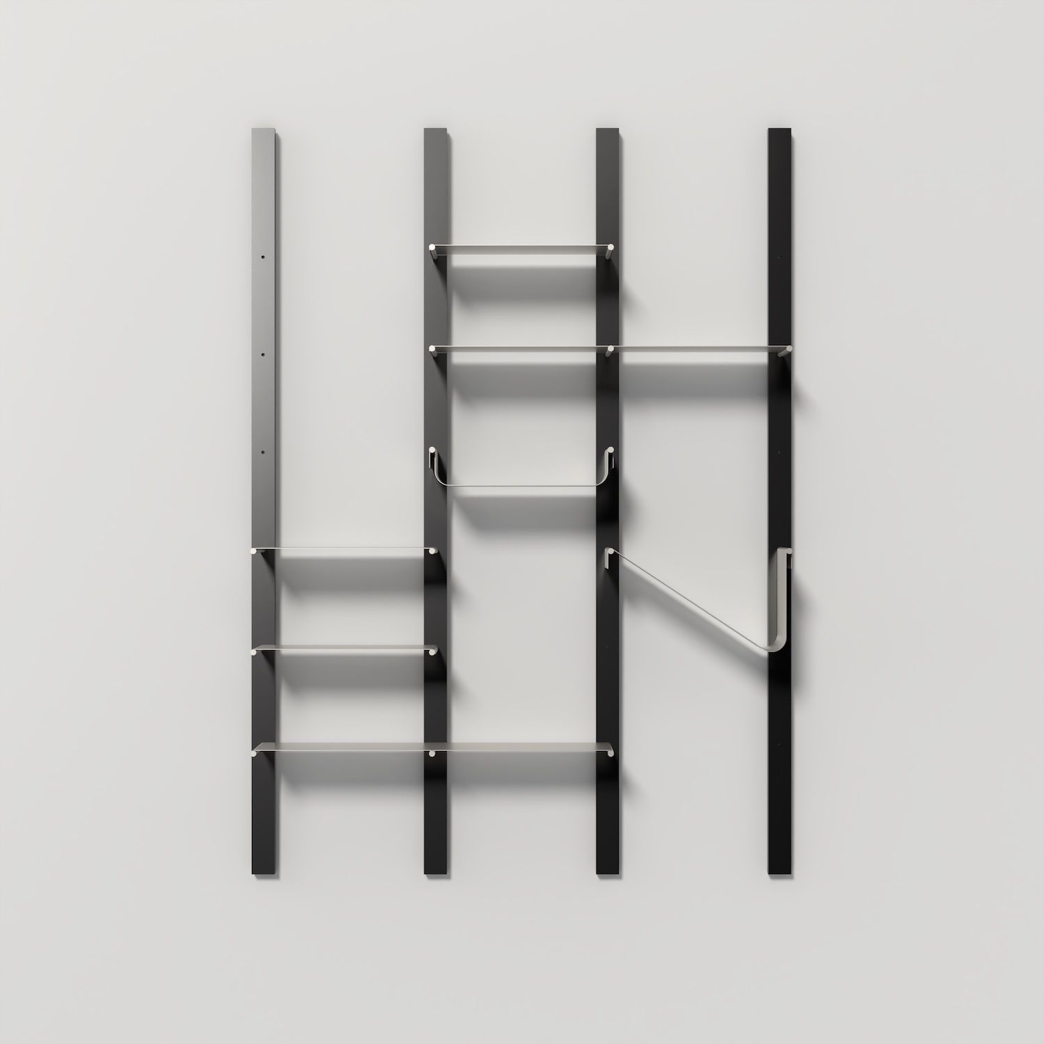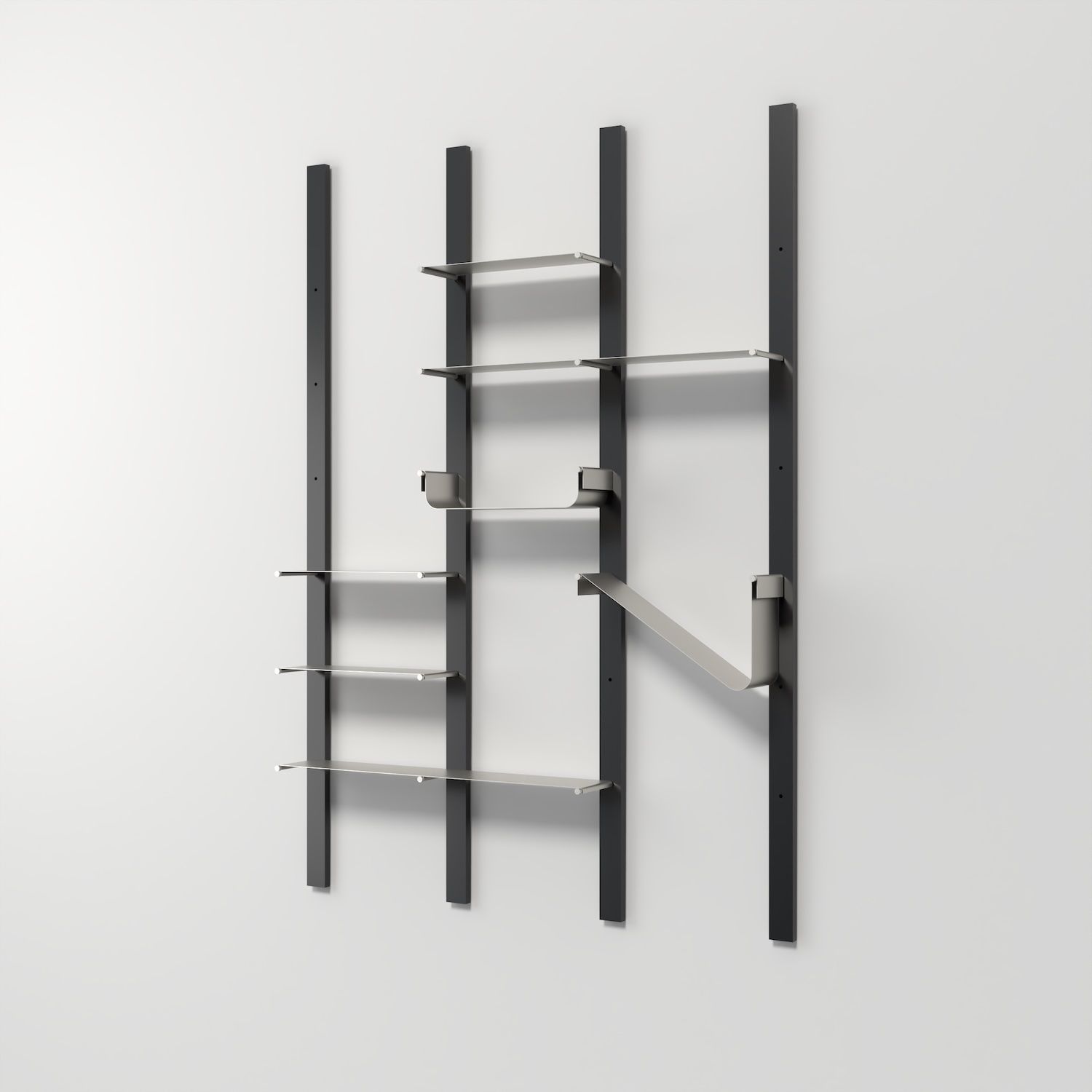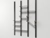 Una libreria che gioca con le forme e con lo spazio. Müve sorprende per la varietà dei suoi ripiani, diversi per geometria e proporzione, da disporre liberamente secondo il proprio gusto. La struttura è composta da quattro montanti verticali nei quali inserire pioli orizzontali: su di essi si appoggiano le mensole in lamiera piegata, ognuna con una forma unica, ognuna un piccolo elemento di design. Grazie ai fori multipli per i pioli, la configurazione può essere personalizzata in altezza e ritmo visivo, rendendo Müve una libreria flessibile, dinamica e personale. Può essere installata a parete o al centro dell’ambiente, grazie ai piedini regolabili che la fissano tra pavimento e soffitto.