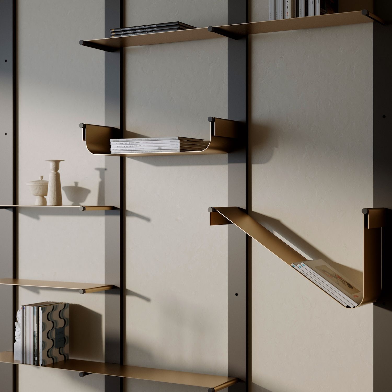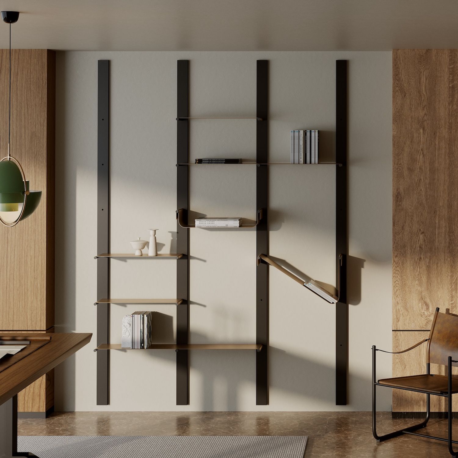 Perfetta per living contemporanei e spazi studio, Müve significa libertà compositiva: trasforma il metallo in una libreria dal carattere giocoso e sofisticato.