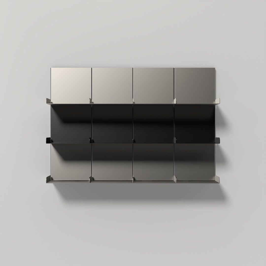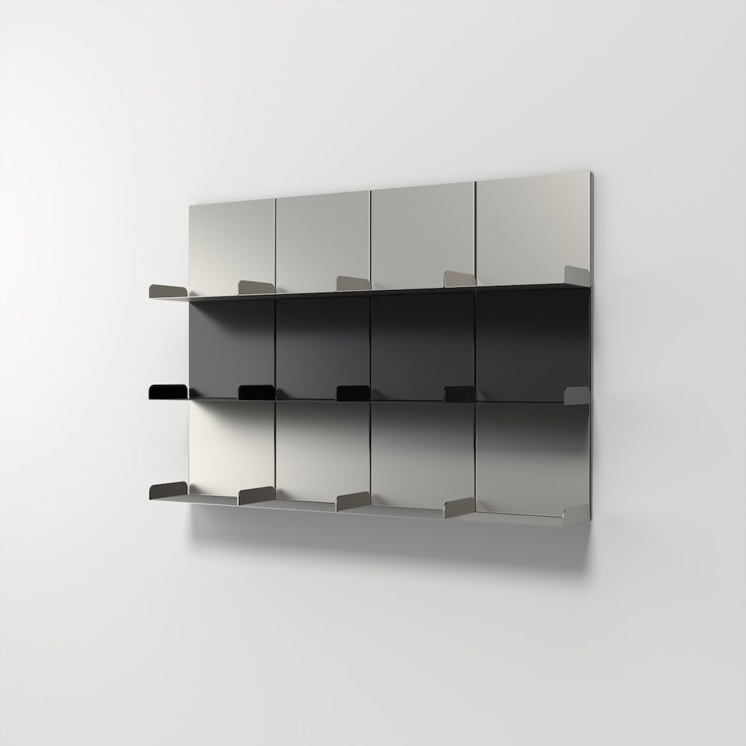 Ribalta è un sistema di arredo modulare in metallo che coniuga rigore tecnico ed estrema libertà compositiva. L’unico limite è la vostra fantasia. La sua struttura a cremagliera – fissata a parete o integrata in una base freestanding – costituisce l’ossatura su cui innestare diversi tipi di moduli in acciaio.