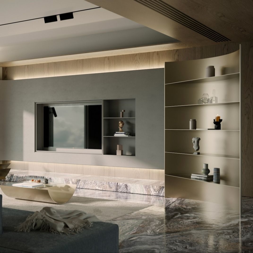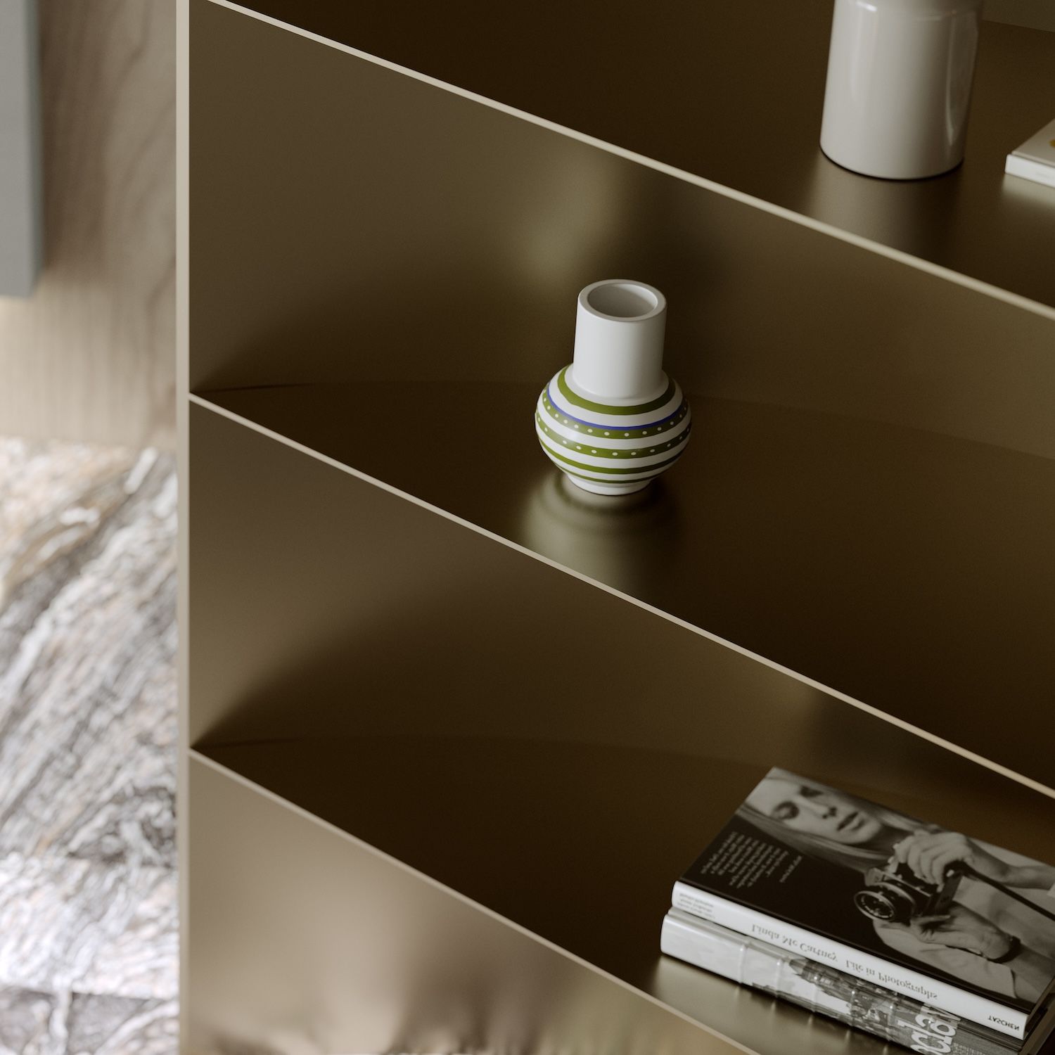 Una grande lamiera curva dà forma alla struttura, avvolgendo cinque ripiani ampi e proporzionati, ideali per esporre oggetti d’arredo. La libreria Luna unisce forza scenica e delicatezza formale: accoglie, espone, mette in mostra. Le linee dinamiche e morbide della sua geometria danno forma a un arredo capiente e utile. È perfetta in dialogo con gli altri elementi della collezione Luna, tuttavia, si impone con carattere anche da sola, come elemento protagonista.